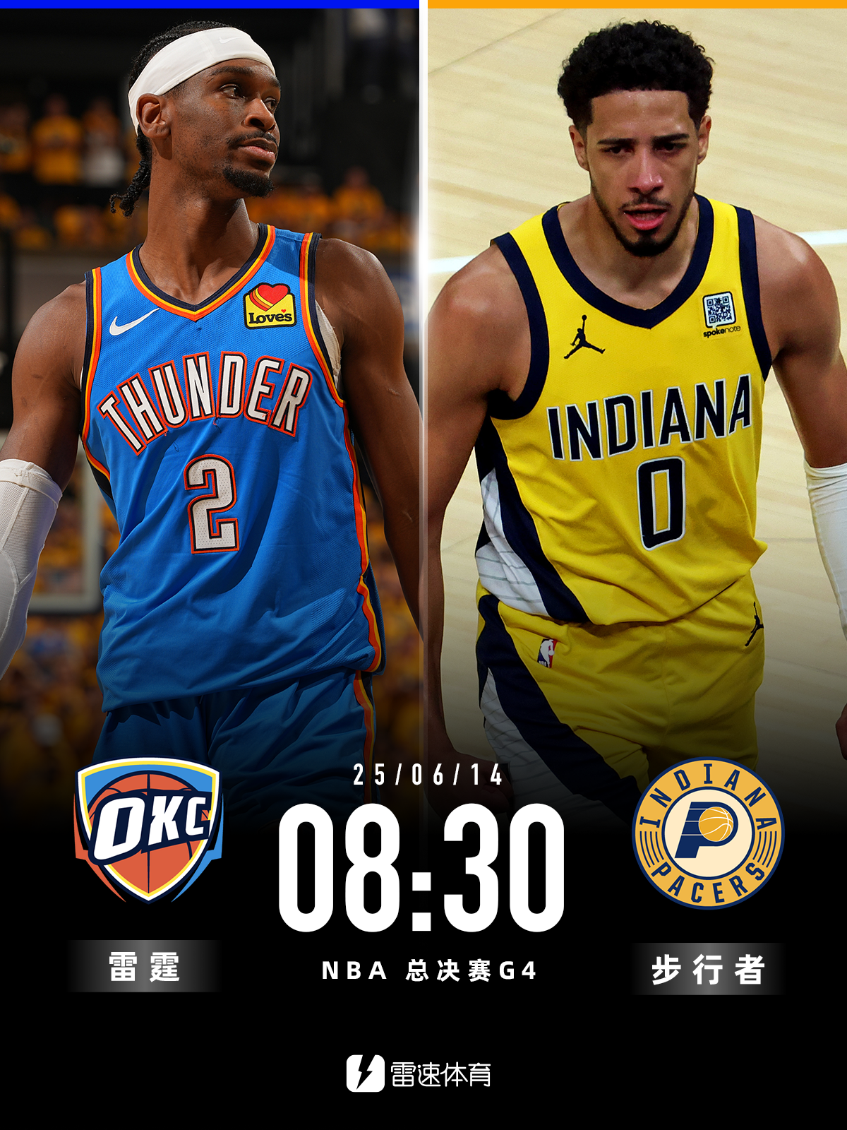 雷速体育6月13日讯 明日NBA总决赛步行者vs雷霆G4。目前大比分步行者2-1雷霆。
